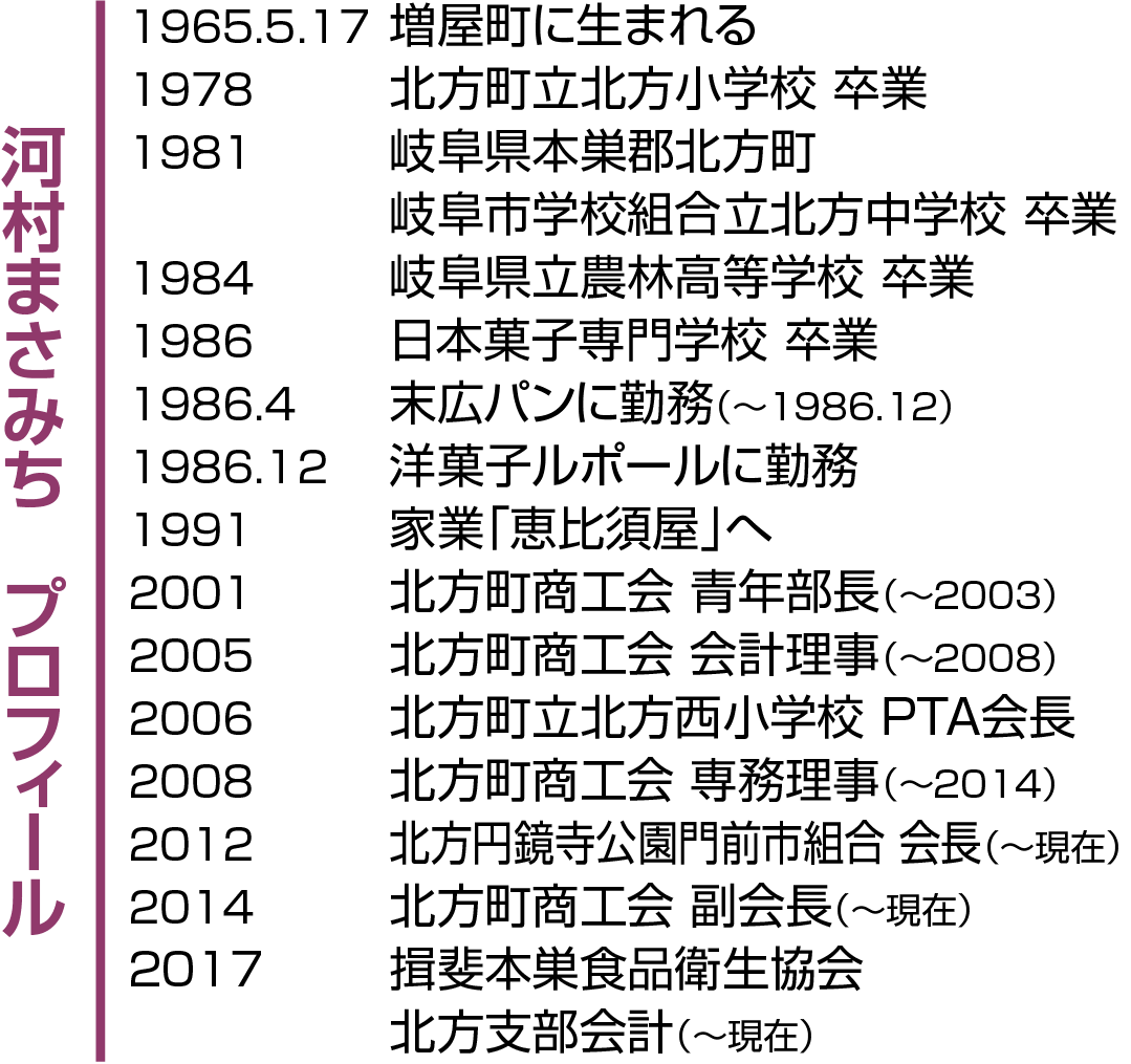私は、和菓子屋を営む「恵比須屋」に生まれ、北方町で育ち、一度北方を離れてみて、逆に、北方の良いところに気づかされました。学生時代の恩師は「北方は中途半端な町だ」と言いました。何故とたずねると「西を向けば北方は都会と言い、東を向けば北方は田舎と言う。だから中途半端なんだ」と。その時は確かにそうだと思いました。しかし、良い方向に考えると、両方兼ね備えているという事です。